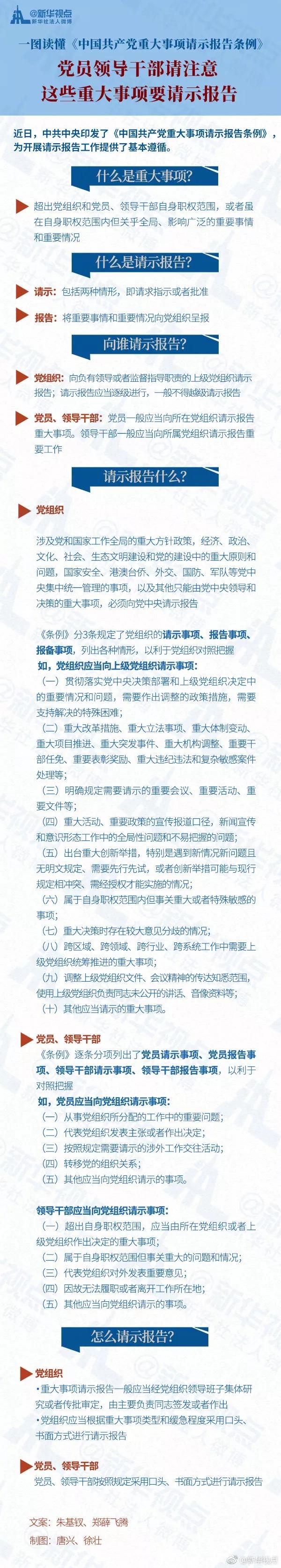 近日,中共中央印发了《中国共产党重大事项请示报告条例》(以下简称《条例》),并发出通知,要求各地区各部门认真遵照执行。