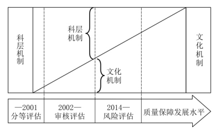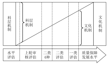 前已述及,怎么进行新一轮审核评估,取决于对质量保障模式和水平的定位(见图 2)。我 国 2003—2008年开展的普通高等学校本科教学工 作水平评估,偏重科层机制质量保障模式,评估指标体系关注质量保障要素,对质量保障制度和文化关注不够,质量保障水平较低;2013—2018 年 开展的普通高等学校本科教学工作审核评估,虽关注质量保障要素,六个审核要素中设置了“质量 保障”要素,增强了对质量保障制度的关注,但对质量保障文化关注仍不够。毋庸置疑,在外部质量保障强力推动下,尤其是经历了水平评估和审核评估两轮评估,我国高等教育内部质量保障能力不断提升。然而,不得不正视的事实是,我国高校质量保障水平参差不齐。经历了水平评估和审核评估的部分研究型大学,正向质量保障文化机制迈进,其余多数高校仍需要加强质量保障制度、 强化质量保障过程与输出性要素。对经历了合格评估但没有经历上一轮审核评估的高校,甚至还要关注质量保障输入性要素。