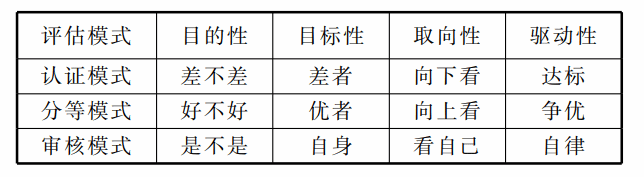 每种评估模式都有其特征(见表 1)[3],认证模式判断的是与规定标准相比“差不差”和“有多 差”,关注“差者”(差项)。即是为找出“差者”(差项),其基本取向是向下。这种模式能驱使“差者” (差项)达标。分等模式判断的是与规定标准相比 “好不好”和“有多好”,关注“优者”(优项),基本取向是向上,能驱使争优。审核模式判断“是不是”, 即该说的是不是说了(目标),说了的是不是做了 (做法),做了的是不是有效(效果),无效的是不是改了(改进)。关注学校自身,不能进行高校间比较,基本取向是用自己的尺寸衡量自己。这种模式能驱使学校自律。