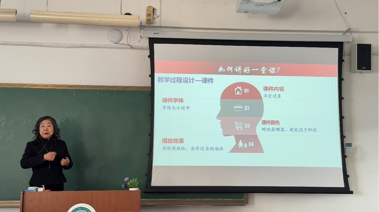 在培训过程中,王老师从教材及学生学情两个方面为青年教师们详细的讲解了如何上好一堂课的技巧和方法,包括课前准备、课件及板书设计、课堂教学管理、教师讲课技巧及师生互动六个方面。王老师首先强调了精心备课的重要性。教师要深入研究教材,对课程内容有很好的理解,不仅要了解教材的内容,还要了解课程在整个专业中的地位和作用。同时,要充分了解学生的学习需求和特点,因材施教,确定合理的目标,使教学内容更具针对性。